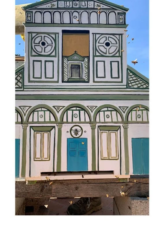In September, 2022, we collaborated with the Lutheran Church of Firenze to establish another set of bee hives in the Marienheim Gardens off of Via de’Serragli in Florence with organic beekeepers Fior da Fiore. Their facade includes a painting by well known artist Massimo Giannoni.
